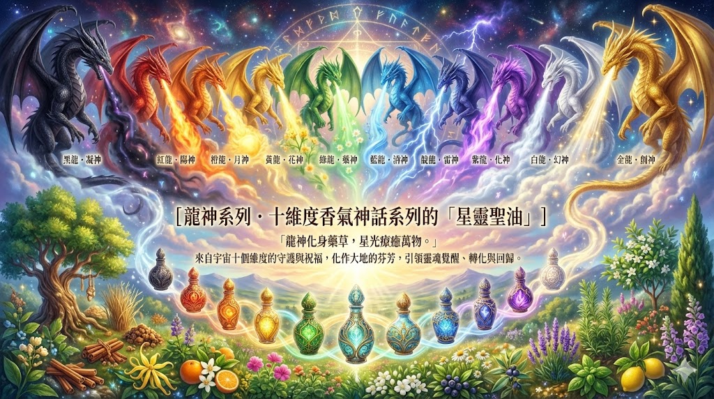 我們相信,每一種香氣都對應著一個維度的神話,每一滴聖油都承載著一位龍神的意志。這不只是關於植物的提取,這是一場跨越十個維度的**「能量轉譯」**。當你開啟瓶蓋的瞬間,你開啟的不僅是芬芳,而是一道通往高維智慧的門戶: