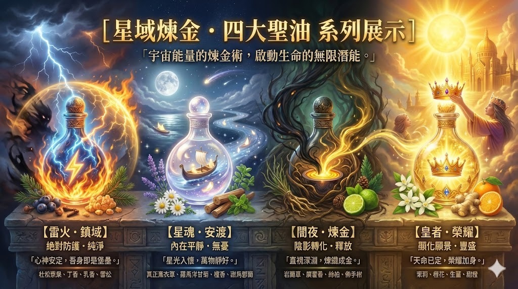 這四大聖油系列,是我們為每一位勇於面對生命的「締造者」準備的禮物。它們分別代表了守護的盾、修復的風、轉化的光與榮耀的火。